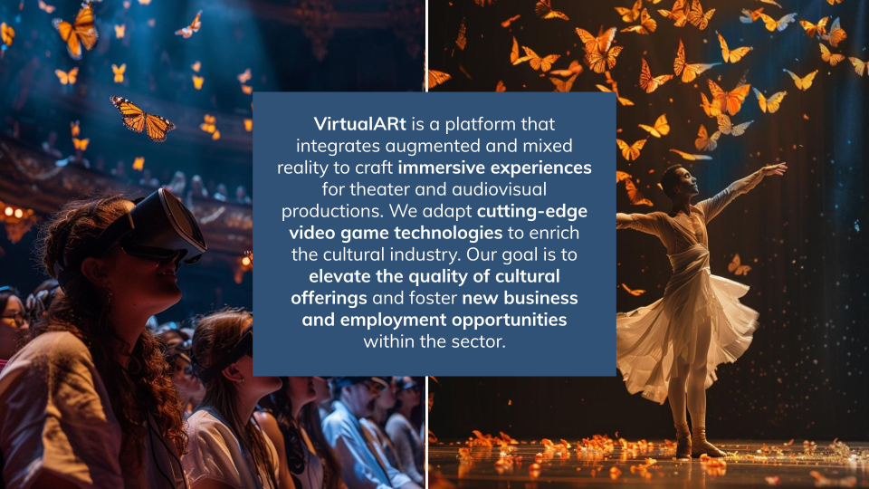 VirtualARt is a suite of innovative tools designed to enable theaters and audiovisual production companies to create immersive experiences using augmented and mixed reality (AR/XR). It integrates 3D animation, advanced engineering, and augmented reality to facilitate the creation of interactive scenes and worlds in theatrical productions or to transform existing audiovisual works, such as movies or short films, into participatory stage experiences.